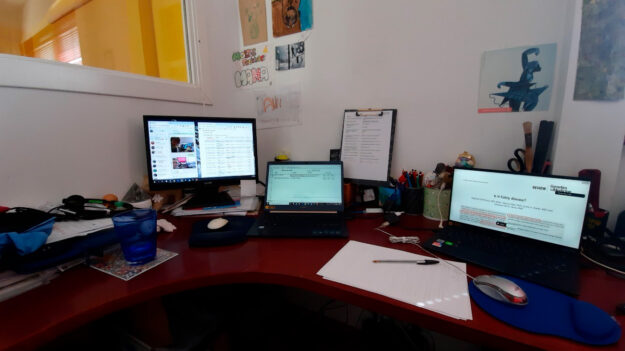 Con la pandemia, la oficina se ha convertido en un estudio de interpretación remota equipado hasta el último detalle.
